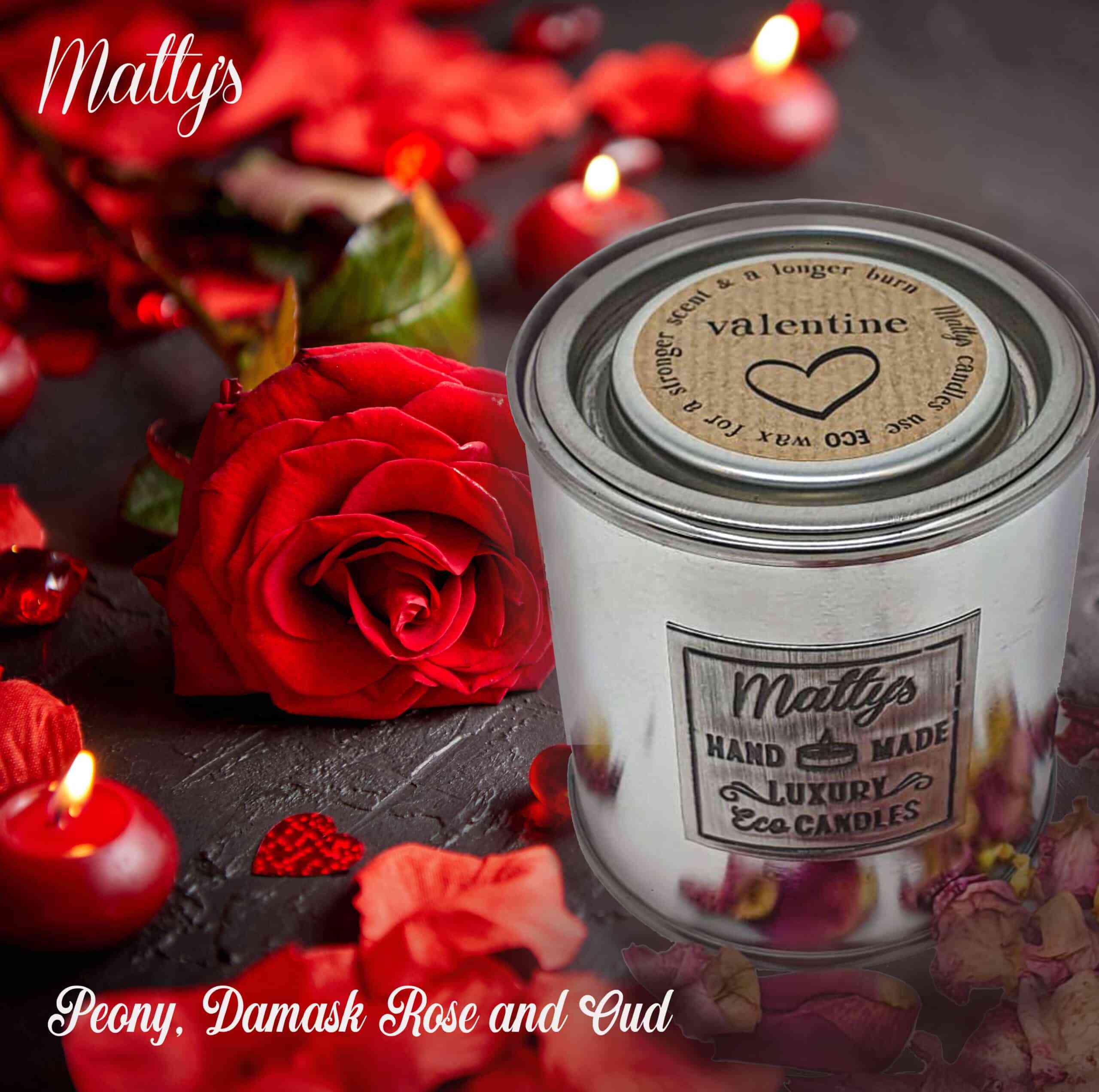 Valentine Candle: Taif rose, peony, clove, vanilla & agarwood in a 200 g eco wax candle. 40‑hour burn, recyclable aluminium tin. Vegan, sustainable, and utterly romantic.